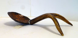 DescriptionSpoon with a shallow, round beaten copper bowl. Handle is of deer antler and splits into a "Y" at about the mid-point of the handle. Antler is dark near the copper bowl and is very shiny overall. Inner surface of bowl is black and orange in color. Outer surface of bowl is black and gray.