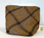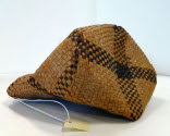 DescriptionFlexible basket of cedar bark. Plain plaiting on the diagonal with checkerboard bands crossing to create a plaid design of dark brown and natural. Flat bottom has solid dark brown rectangular center.On View