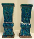 DescriptionPottery vase of greenish blue glaze. Square shape design of flowers in relief. Lower section has Chinese symbols designs in relief.On View