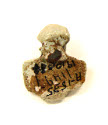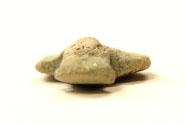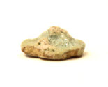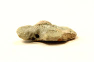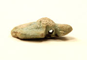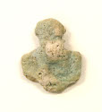 DescriptionVery faded light blue-green glaze. Totally indiscernible surface. Back dark old color. Tiny hole through the narrowest part. The amulet is flat on the back and dimensional on the front surface. The shape is irregular but symmetric. Half disc with head possibly the goddess Bastet with the sun disk on her head. Indistinct.On View