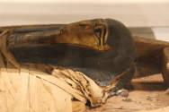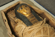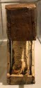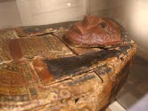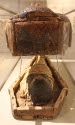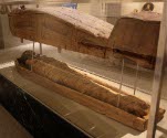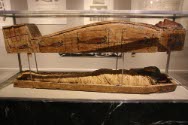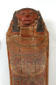 DescriptionMummy and inner case of sycamore wood from tomb in Flascht, Egypt; Saitic Period; wood coffin with painted decoration over plaster layer of various gods including sons Horus, Anubis, the goddess Mut and badly written (possible prayer from Book of the Dead) columns of hieroglyphs; black, green, red and white varnished/shellacked; mummy wrapped in linen strips with gilt cartonnage face maskOn View