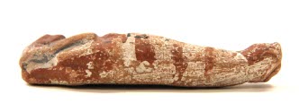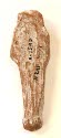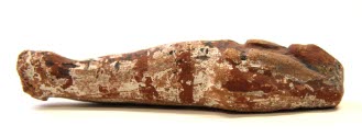 DescriptionReddish clay figure of man in typical ushabti position (feet together, arms crossed); painted a dark reddish brown with a black wig and black hieroglyphs running down the front; undercoating of white paintOn View