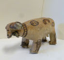 DescriptionPottery dog (recorded as cow in E book). design on its back in brown (10 R 3/2) and rust (7.5 R 5/5). Mouth wide open, eyes and nose painted on. Double band joined by hort perpindicular lines around neck (collar). Slip is off-white (7.5 YR 8/2) on the bottom and (7.5 YR 7/4) on the top where discolored.On View