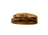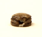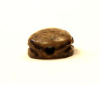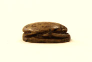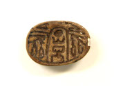 Small brown scarab, carved with legs on sides and beetle features on top (mostly worn away), inscription on underside of a cartouche with double pestles (?) on each side. Pierced through with hole for stringing.