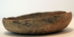 DescriptionShallow, flat-bottomed bowl with polished interior, rough exterior surfaces. Multicolored buff, black, red-brown.