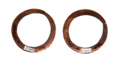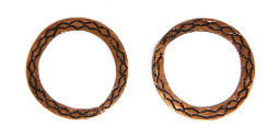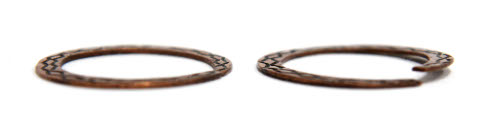 DescriptionPair of copper earrings. Pattern of diamonds inscribed and darkened on one side.On View