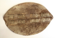 DescriptionThe shield is a light brown and white color. The material is some sort of fur. There is a different type of fur interlaced down the center.On View