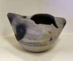 DescriptionMancos Black on White tri - lobed pitcher, duck-shaped. Slipped with white, design in faded black consists of 3 bands running around jar.On View