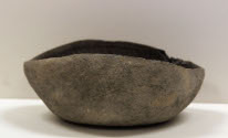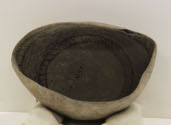 DescriptionMancos Black on White, light gray slip, black geometric design on interior. Unevenly shaped. Flat base. Rim decorated black, brown around side near flat bottom.