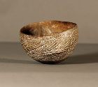 DescriptionBrown, scraped smooth on outer surface, finely polished. Hole bored through muli end. Kava cups are made from the muli end of the coconut cut transversely. Through the projecting muli a transverse hole is bored, through which a sennit cord is usually attached. Outer surface incised with interlocking waves pattern, whitened with lime.Engraved beneath rim: "TU.TU. GOA"
