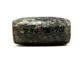 DescriptionCylindrical bead. Mottled dark grey stone, possible serpentine; very wide hole which tapers to a narrow opening in center of bead (i.e., unfinished?); finely ground and polished surfaceOn View