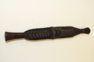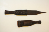DescriptionWooden handle and sheath. Wire twisted around sheath near top and bottom holds natural wood half to blackened half design incised. Blade-iron?On View