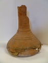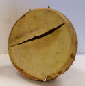 DescriptionDrum made of terra cotta pottery with spiral zigzag design indented. Skin across wide end, tied, split in center. Neck end of drum is broken.On View