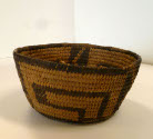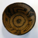 DescriptionBundle-coiled construction. Knotted coil start. Self-coiled rim. Design in dark brown devil's claw or martynia. Design of flat base, dark center with one circle. On the sides fret-like blocks with three dark vertical rectangles with light zig-zag in center. Dark rim. Bowl shape.