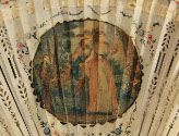 DescriptionIvory Brise fan carved and painted.  The central medallion, a stipple engraving, shows two women walking out of doors, with a young man standing behind a tree watching them.  Flowers are painted around the medallion and across the tops of the sticks above the white silk ribbon connecting them.  At the bottoms of the end sticks there is inlaid tortoise shell.On View