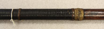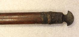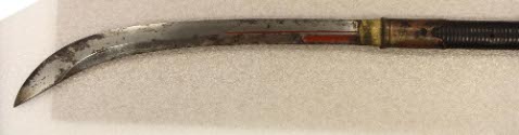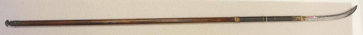 DescriptionWoman's naginata, curved blade with red painted indented lines on one-edged blade. Polished oval wooden shaft with metal end. Steel? blade set in brass, copper plate at head end over black lacquered wrap. Three copper rings spaced over lacquer ending in gold painted braid.On View