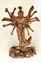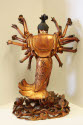 DescriptionCarved wood goddess, bronze painted with 21 arms, hem of robe swirls to prayer left bare feet on lotus blossoms, base of foliage and flowers.  hair in tall black top knot of 5 sections.On View