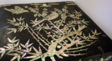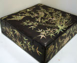 DescriptionLarge square wood box, top covers bottom, top dark lacquer with mother-of-pearl inlay on all sides and top. Top has two birds, foliage and flowers. Two sides have floral design, two have bamboo designs. Edges held together with decorative metal straps. Lined in green patterned wallpaper.
