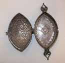 DescriptionOval box with pointed ends. Silver in color with blue, green, and yellow enamel. Carved vines and flowers cover top and sides of box. Handle on each pointed end. One round side has a hinge, the other side has a broken fastener. Bottom of box has central flower design inside a geometric border. Hangs on cord around neck.On View