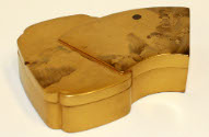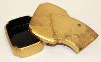 DescriptionGold lacquer box and lid of unusual shape, left side is a rectangular lozenge with a fan shape projecting out to the right, with mountain scene on lid.On View