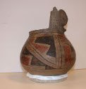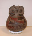 DescriptionOwl effigy vessel. White slip, upper 1/2 painted with three panels of grecas in red and black. Head of owl (stylized) projects from rim. Small projections from top of head, one of which broken off. Body of head decorated with black spots.On View