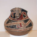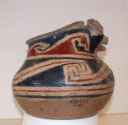 DescriptionWhite slip with polychrome design linked grecas in red and black. Unidentified modelled animal head at rim. Style characteristic of this culture.On View