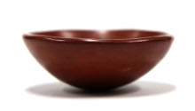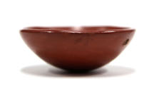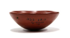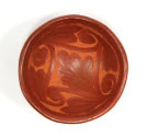 DescriptionRound, red, glazed. Unglazed decoration interior. Tiny hole at one side. Matches water bottle E 1279. Leaf design.On View
