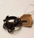 DescriptionLady's brass finger ring. Grooves at back, relief pattern at front with three rings .8 cm in diameter, attached by loops.On View