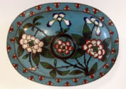 DescriptionSmall, covered, cloisenne dish. Oval in shape. LId seems to be stuck onto the dish. LIght blue backround. Floral design with green leaves and white, red, pink, and blue flowers. Lid has a finial with a single flower on it. Bottom is plain blue.On View