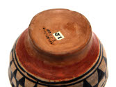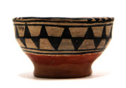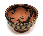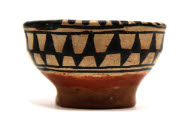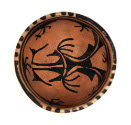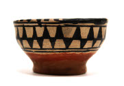 DescriptionThree shades of terra cotta with design in black. Interior and exterior decorated. Slight stand and concave bottom.On View