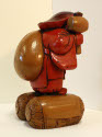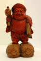 DescriptionFigure of smiling man painted red, standing on 2 rice bales painted tan, holding a tan sack over left sholder and sledge hammer in right hand. Top of hat has been blackened. Hotei.