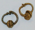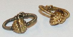 DescriptionEach oval shaped strand of coiled wire, with two halved round beads. One has "gold"wire, the other silver both have gold beads.On View