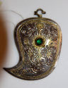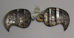 Description2 large petal shaped pieces of hammered metal that hook together. Intricately carved with floral designs. The center of each features a pointed green gem. In the middle is a round piece of metal, covering the clasp, that features a pointed red gem. Across the back of each is a set of metal bars, 1 thick, 1 thin, that span the widest part.On View