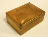 DescriptionRectangular lacquer box with lid. Gold in color on the outside, brown and black speckled on the inside and bottom of box. Lid has raised decoration, featuring 3 birds in the branches of a flowering tree. Cigarette box.