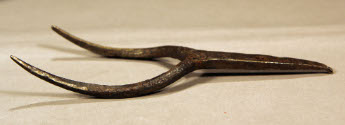 DescriptionSmall, two-pronged fork, possibly child's play fork.Hook has two curved prongs, one side shorter and blunter than the other. The handle of the hook has a small, rectangular-shaped hole that is cut through to the other side. The end of the handle is folded over onto itself.