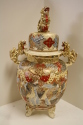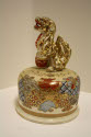 DescriptionPictures of 4 men on each side. Red, grey, blue, black and metallic gold decorations. 2 gold colored lion handles on jar. One on cover - raised designs - 3 legs.On View