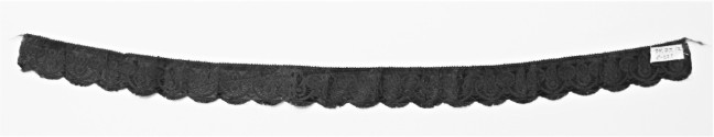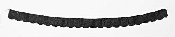 DescriptionOne of three old black collars. Satin embossed ribbon, one edge scalloped.On View