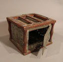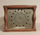 DescriptionSquare foot warmer made of tin with holes punched in circles on the sides and in rows on the top. The tin box is enclosed in a wooden frame with a wire handle on the top.On View