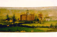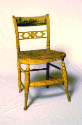 DescriptionSide chair of Sheraton influence, pine wood painted to resemble graining. Rabbit ear back post support back splat with a small painting that resembles the Old Mill on UVM campus. At the middle of the back, the back posts are joined by an openwork back piece. The legs are turned and knobbed. The seat is rush.On View