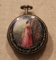 DescriptionVerge-fusee movement. Heavy silver front opening case with enamel of a young lady in a garden. Winds through the face. Brequet face and hands (gold).