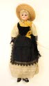 DescriptionCostume, Swiss. White dress, black velvet bodice trimmed with yellow, straw hat. Blond hair, China.On View