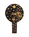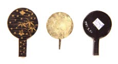 DescriptionMiniature lacquered mirror box and metal mirror. Black and gold designs on cover, contains mirror inside.On View