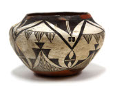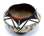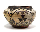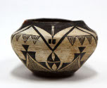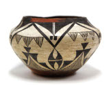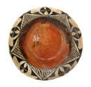 DescriptionLarge bowl, interior has reddish rim, yellowish. Exterior, bottom reddish design dk. brown paint and white slip. Design pattern repeated five times, brown on white. Bottom concave but off-center.Drawing on back of catalog card.