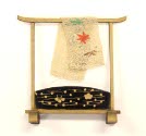 DescriptionMiniature lacquer material rack with material. Black and gold designs at the bottom of the rack.On View