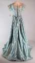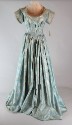 DescriptionBall dress made of blue and white floral striped silk. The stripes are woven horizontally. They are used to edge the short sleeves, and also as an added band just below the neckline ending in a chevron formation at the center front. The upper edge of the band, the neckline, and the ends of the sleeves are all trimmed in "English Lace" or "baby" lace. There is also a blue silk braid trim just above the band on the sleeve edges. The bodice is first hooked up the back, then laced. Both bodice and skirt are lined in glazed cotton.