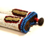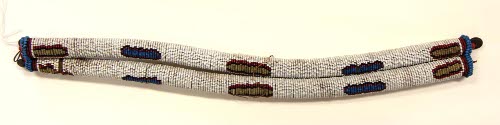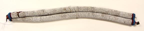 DescriptionTwo beaded rope stitched together at the ends; Background of white beads; Each roll has 5 colored motifs of three colors; On both ends and in the center are oblong-shaped motifs of red, black and vaseline yellow; Two motifs black, red and sky blue between; Ends bordered with 2 rows of sky blue and translucent red; Brass buttons attached with 2 large (6mm) translucent red wtih white core beads, and loopsOn View
