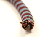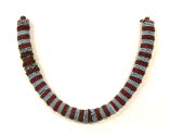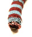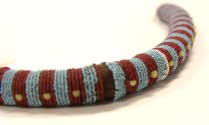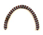 DescriptionBeaded rope: alternating bands (7mm width) of 4 rows of opaque light blue and translucent red/white core beads. In center of red bands on 2 strands there are large (5 mm in diam) vaseline yellow beads (orginally 29). After 22nd band from one end, there is one row of white beads. At each end, there are 2 rows of pink beads each with a white bead, 1 conical brass button, 2 (5mm0 red/white core beads. One end has a loop made of fiber strings. One end has a plain brass button.On View