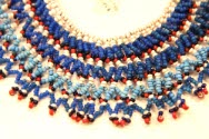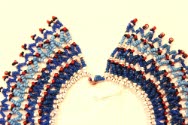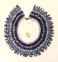 DescriptionLacy pattern of white, blue, red and black beads. The inside edge is of white beads and is separated from the band of dark blue by 2 white beads. Total of 4 bands of different shades of blue separated by white, black and red beads. Mother-of-pearl button and a loop of 3 different shades of blue, white, and 2 red/white core beads.On View