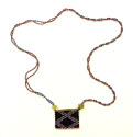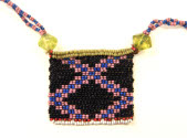 DescriptionTab of beadwork attached to a double strand loop. Tab has top border of 2 rows of vaseline yellow beads with 2 red beads on the end of each row. Black background with a diamond-shaped pattern of mauve and blue beads. Border at the bottom is a row of translucent red/white core beads in groups of two and a row of white. At each top corner of the tab is a large faceted transparent yellow bead. The loop is made of two twisted strands of beads, alternating two blue, 2 mauve beads. 1 red bead replaces a mauve bead.