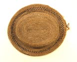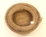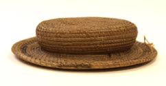 DescriptionEuropean style straw hat. Small, flat hat with a brim. Constructed from round fibers, coiled and wrapped and bound together with flat, narrow, reed-like fibers. Has a black stripe around the brim.On View